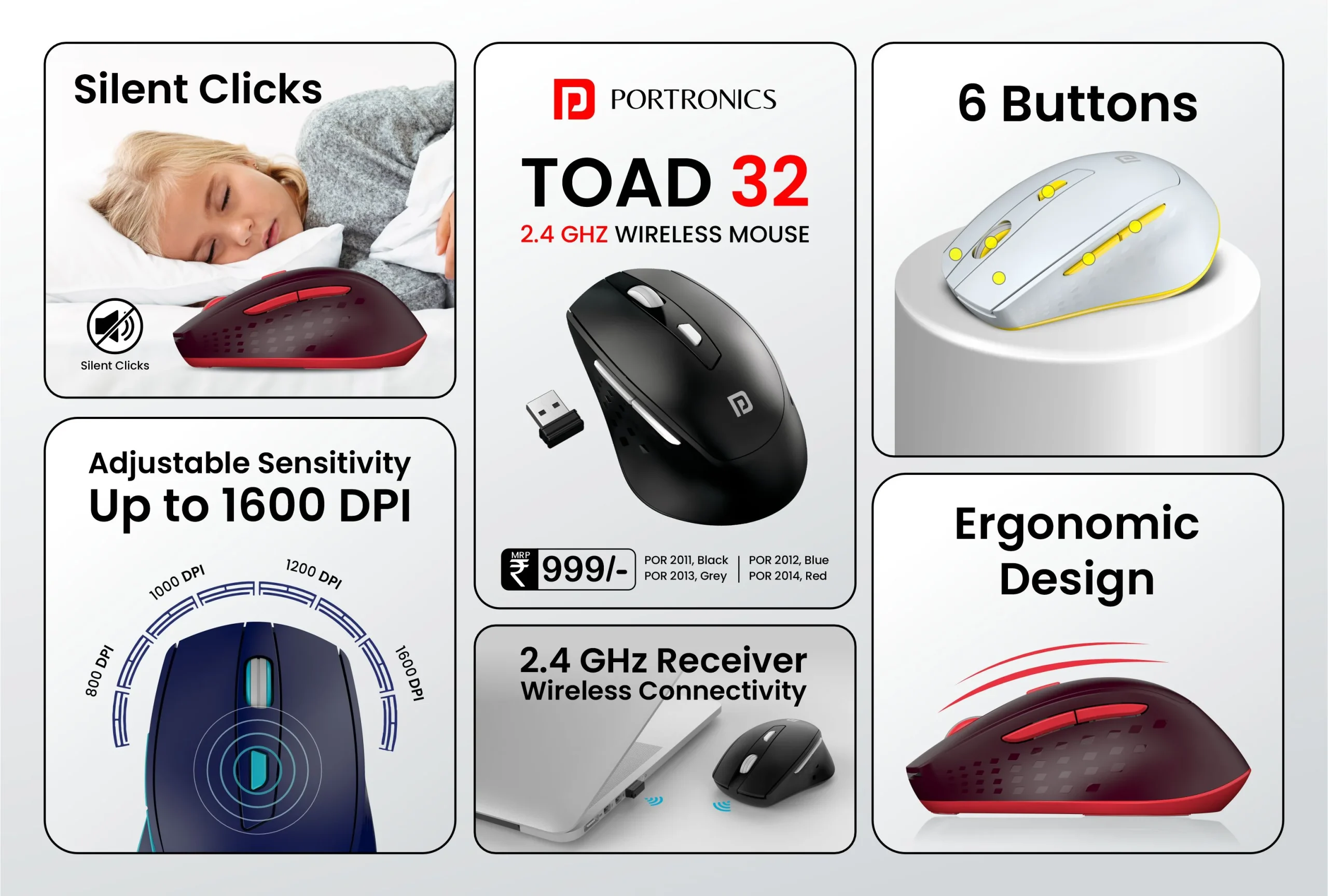portronics Toad 32 Adjustable DPI up to 1600 | Universal Compatibility | Silent Clicks | Energy-Efficient